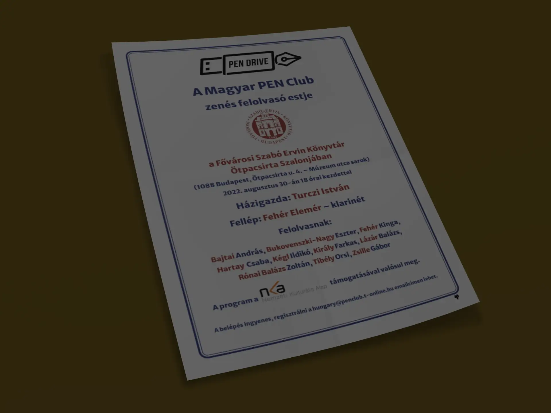 Lesungen von András Bajtai, Eszter Bukovenszki-Nagy, Kinga Fehér, Csaba Hartay, Ildikó Kégl, Farkas Király, Balázs Lázár, Balázs-Zoltán Rónai, Orsi Tibély, Zsille Gábor